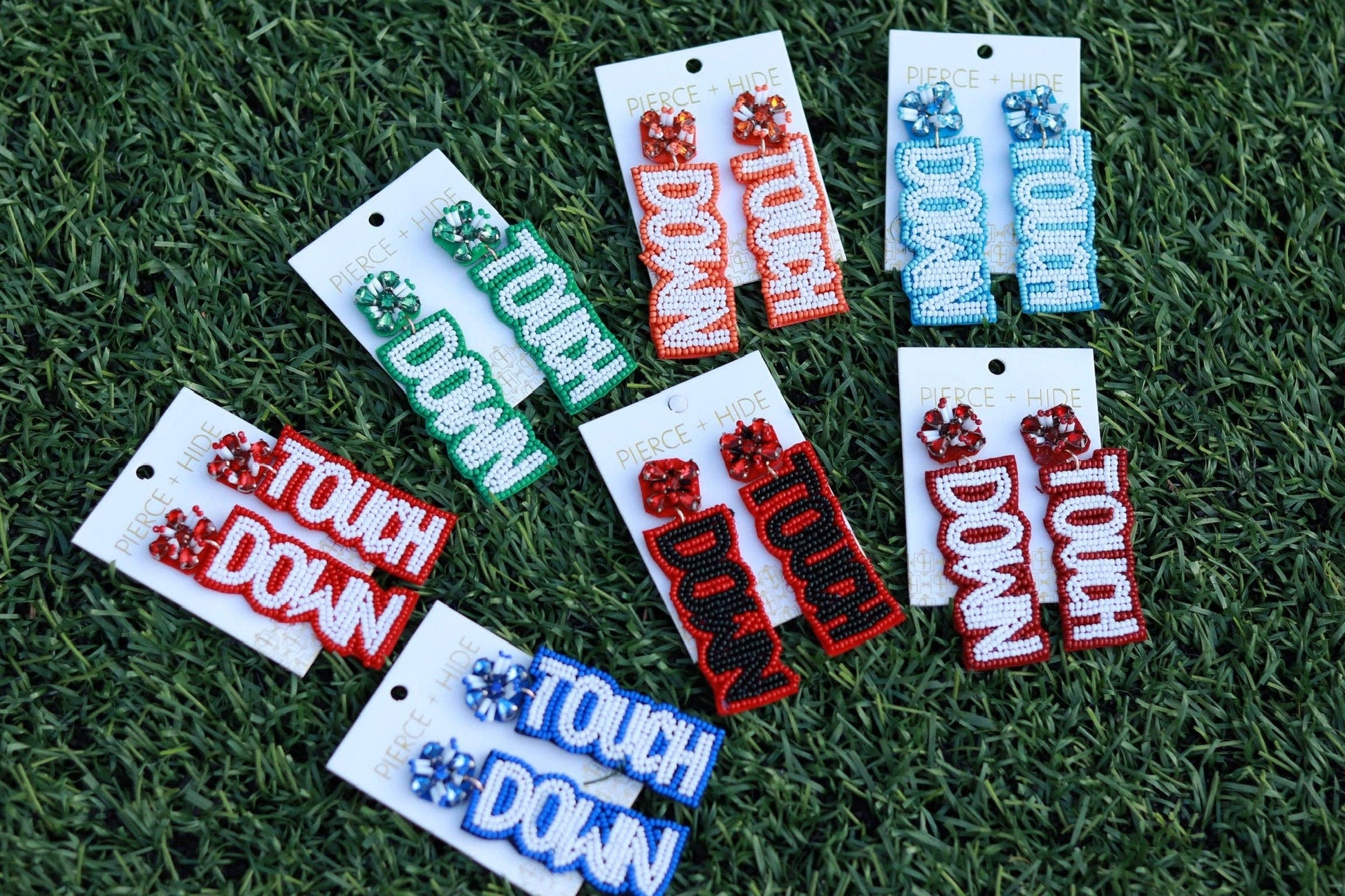 Custom Beaded Touch Down Earring| Game Day Earrings| Football: Carolina Blue + White