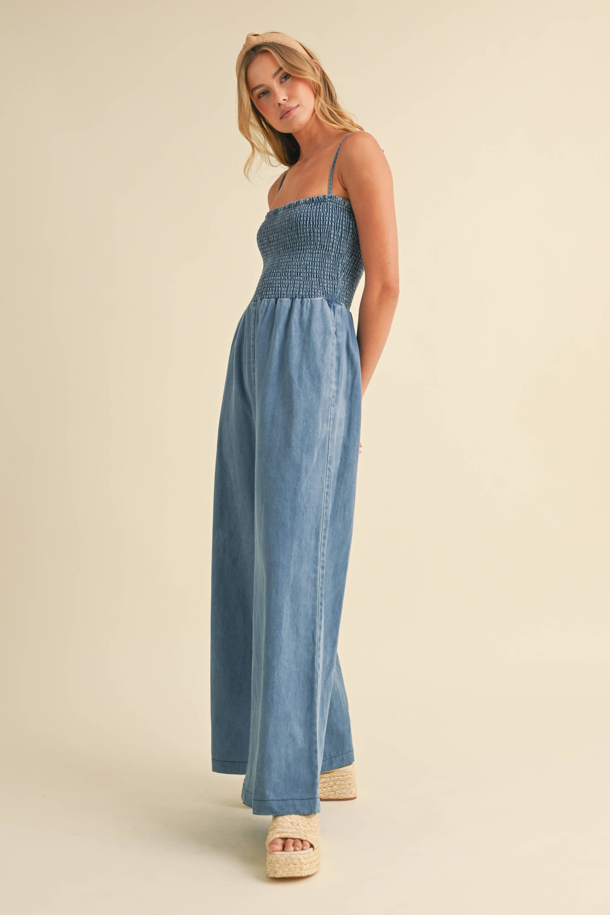 SMOCKED SPAGHETTI STRAP WIDE LEG JUMPSUIT WITH