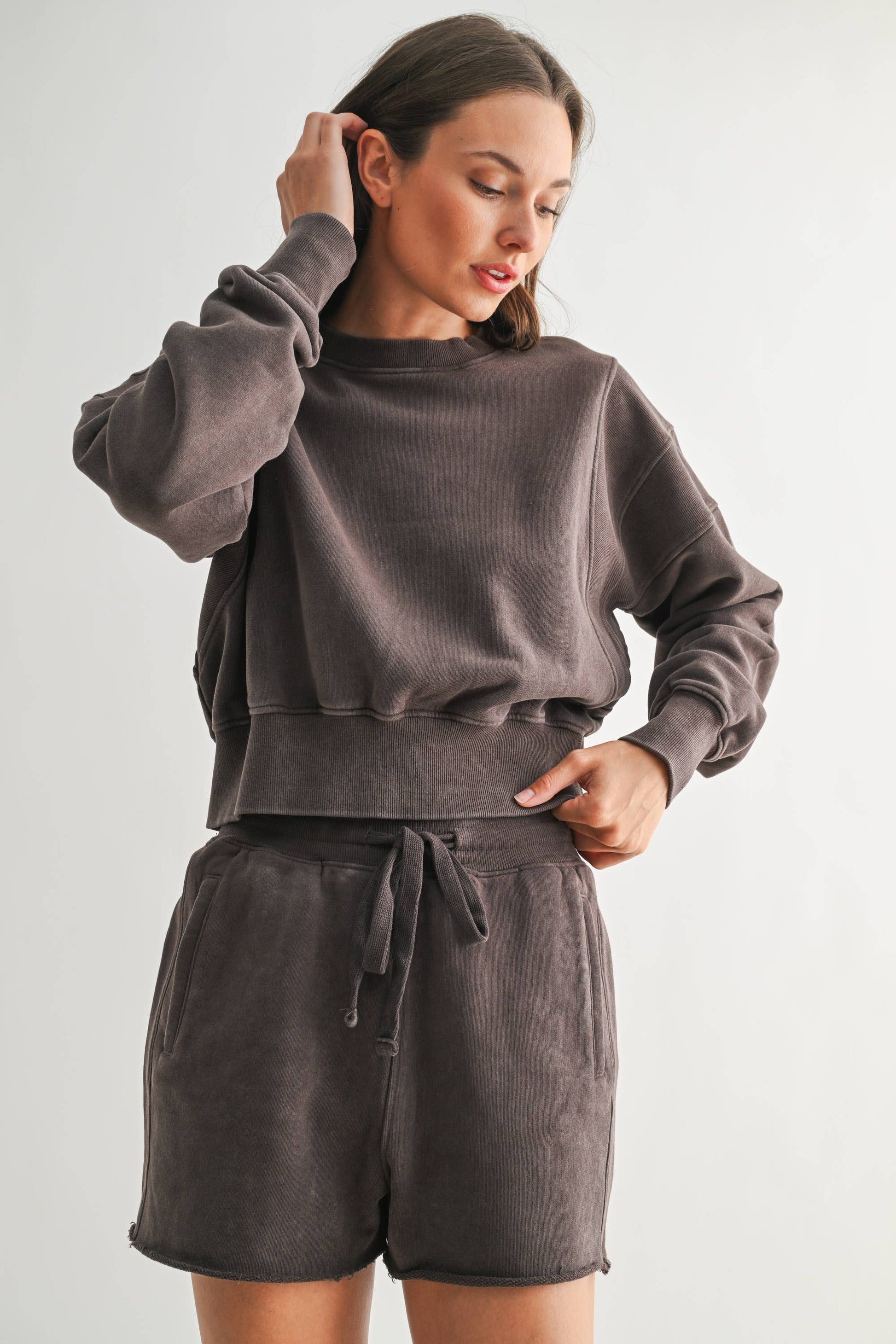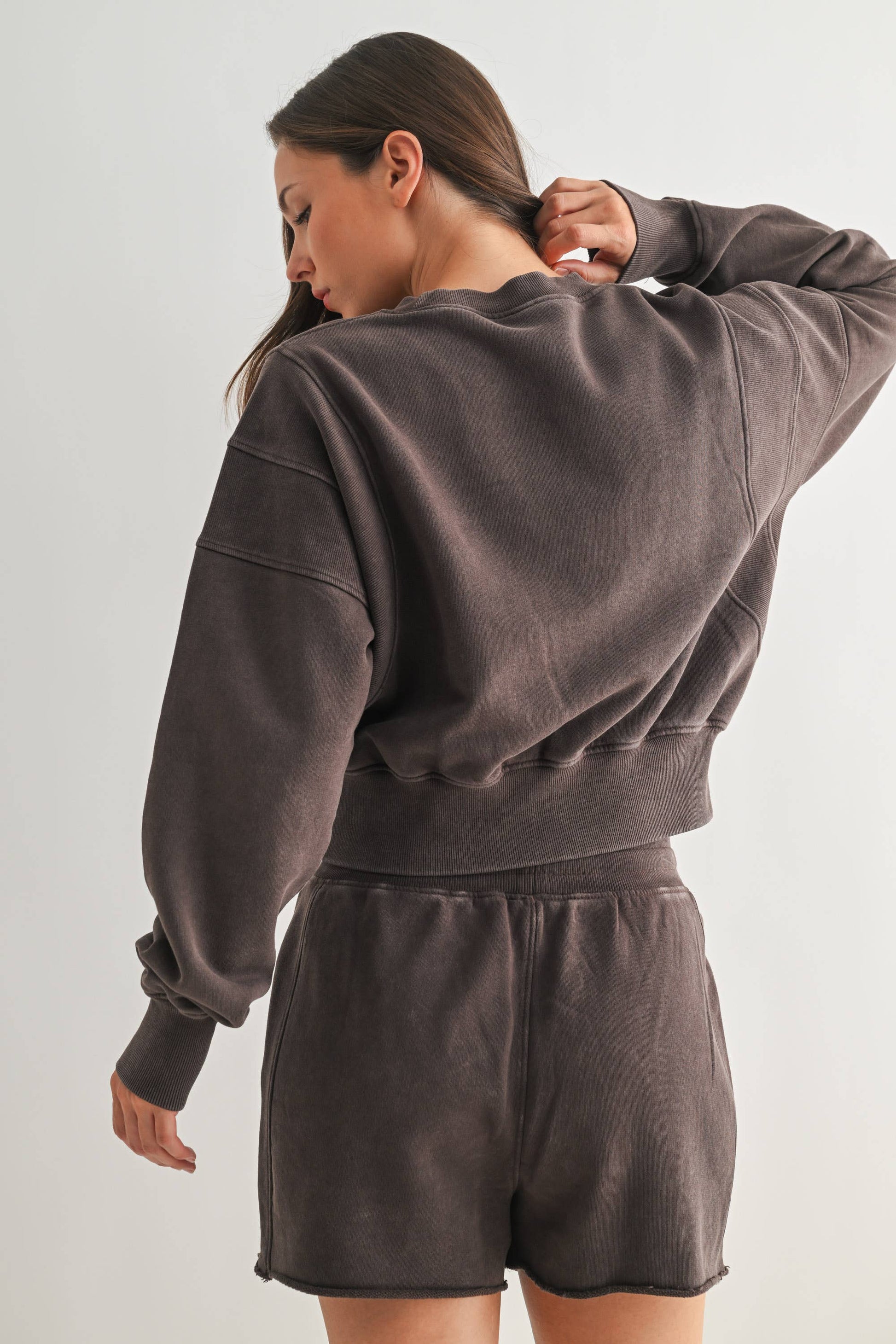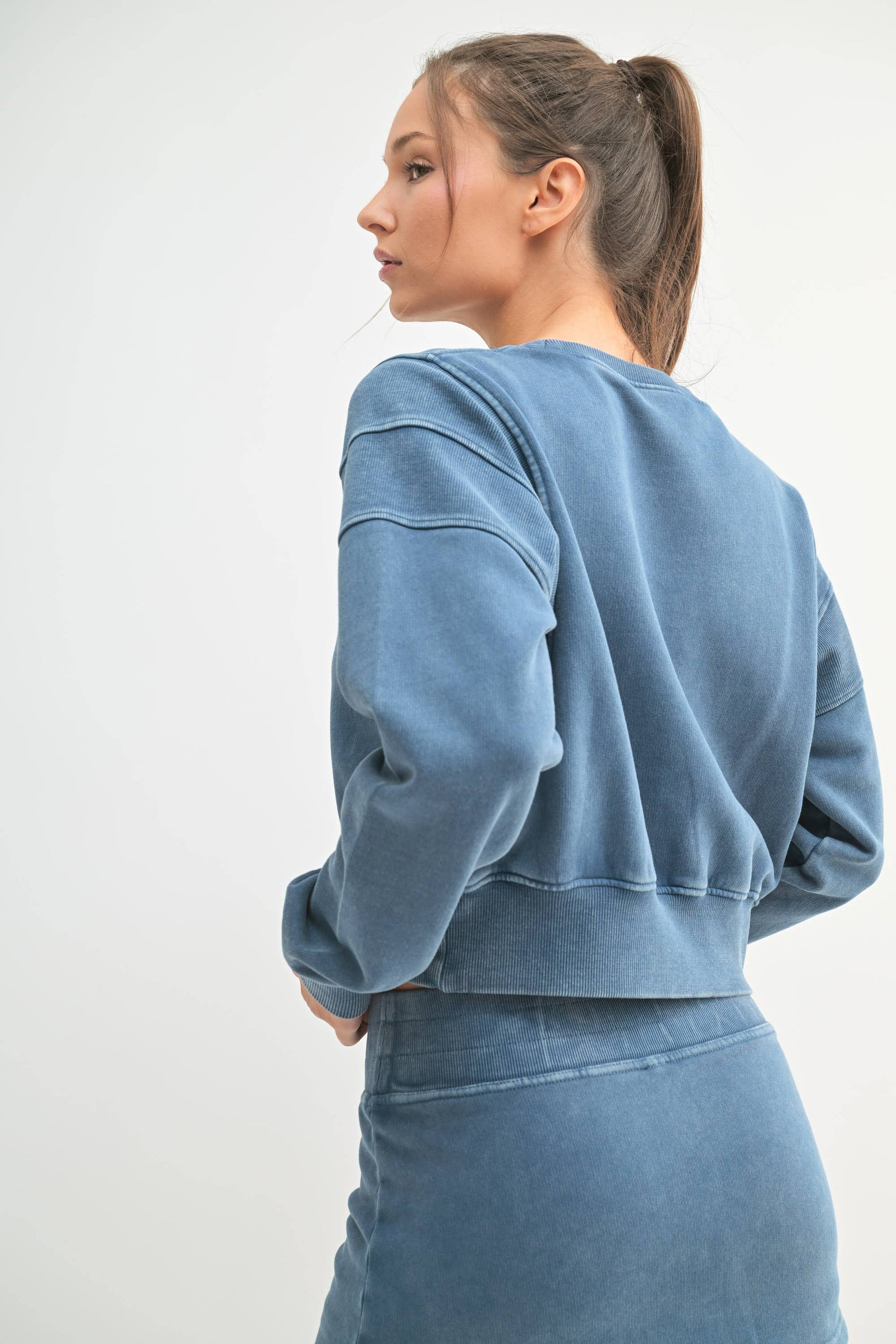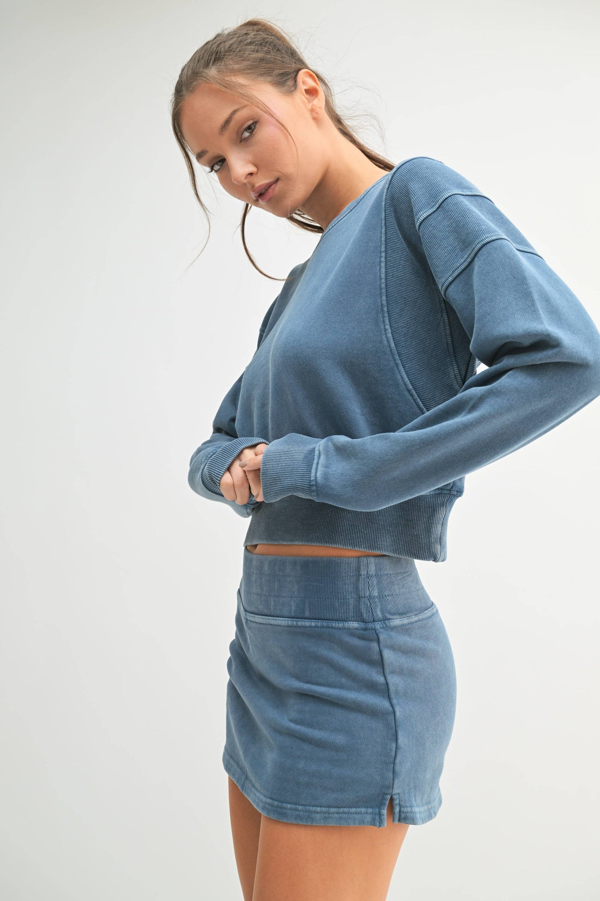 Discover ultimate comfort and style with our Mineral Wash Cropped Sweatshirt. Crafted from soft cotton fleece, this unique piece features ribbed contrast armhole sleeve panels and a wide ribbed waistband for a comfortable fit. The crewneck design and cropped length create a trendy silhouette, while the mineral wash gives each sweatshirt a one-of-a-kind look and feel. Perfectly paired with our KP5323 Skort, this sweatshirt is a versatile addition to your casual wardrobe, offering both coziness and flair.